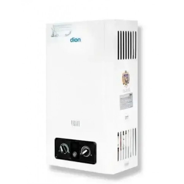 Dion JSD 10 – газовый проточный водонагреватель. Удобство и практичность этой колонки состоит в разжигании от батареек. Когда открывается кран и вода начинает течь, колонка зажигается. Когда кран перекрывается, колонка гаснет. Таким образом нет фитиля постоянно горящего. Это позволяет сильно экономить на потреблении газа. Отвод продуктов сгорания производится естественным способом с помощью дымохода.