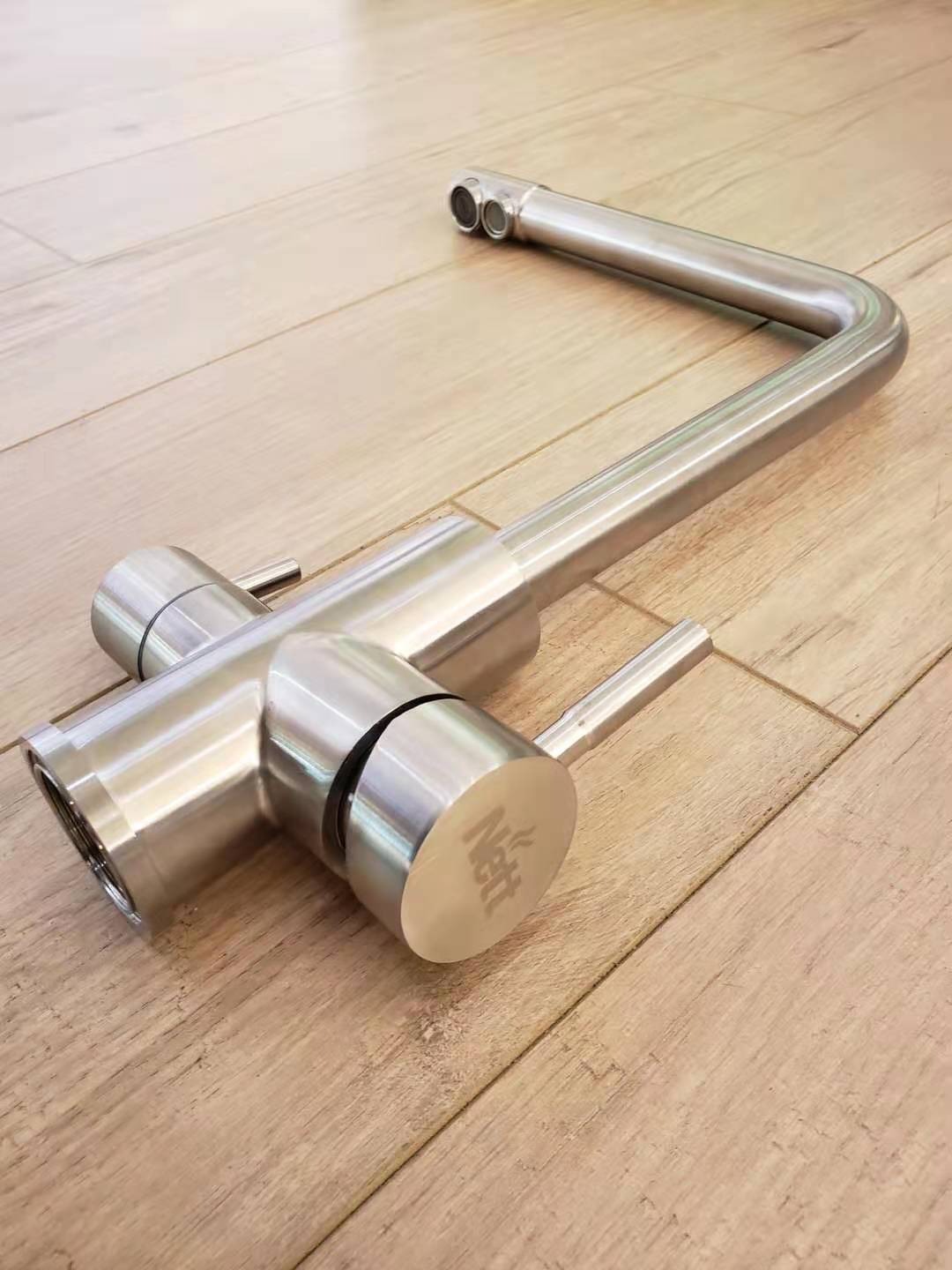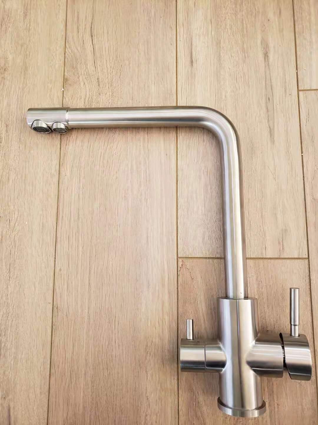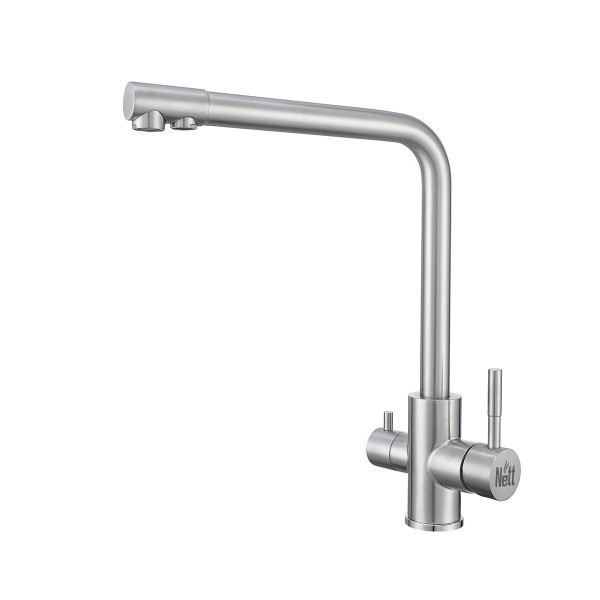 Смеситель оснащен фильтром и может быть подключен как к водопроводной, так и к фильтрованной воде. Управление потоком воды осуществляется двумя удобными рычагами.