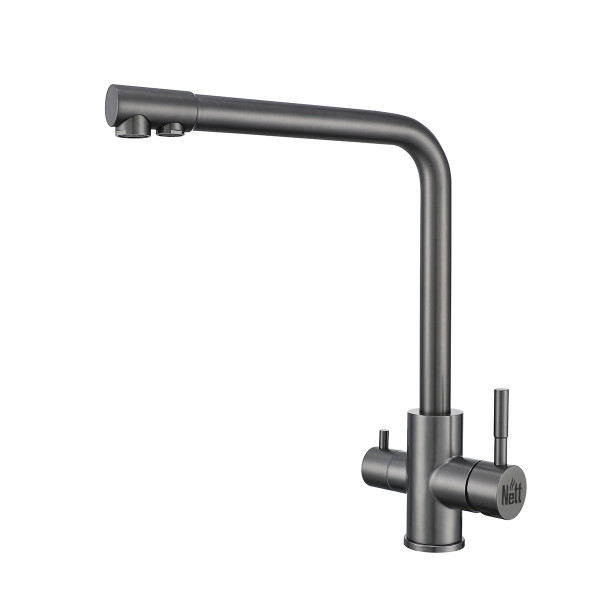 Смеситель оборудован фильтром и может быть подключен как к водопроводной, так и фильтрованной воде. Управление потоком воды осуществляется двумя удобными рычагами.