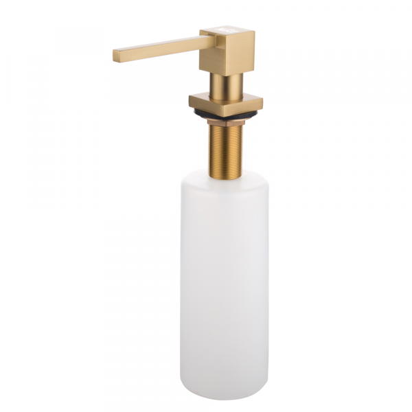 Дозатор для моющего средства Nett устанавливается на кухонную мойку или на столешницу, диаметр отверстия 30мм, и позволяет освободить пространство рядом с мойкой от ёмкостей с моющими средствами.Головка дозатора выполнена из нержавеющией стали 304 марки с золотым матированным покрытием.