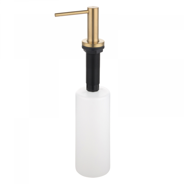 Дозатор для моющего средства Nett устанавливается на кухонную мойку или на столешницу, диаметр отверстия 30мм, и позволяет освободить пространство рядом с мойкой от ёмкостей с моющими средствами.Головка дозатора выполнена из нержавеющией стали 304 марки с золотым матированным покрытием.