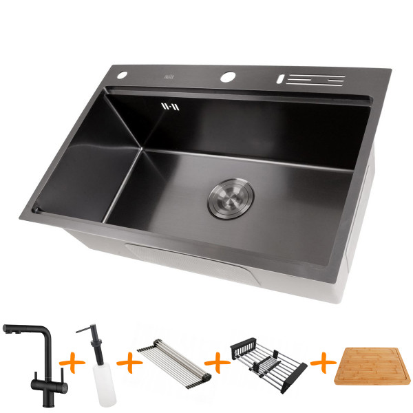 Комплект черной мойки на кухню и смеситель из нержавеющей стали NB-7048