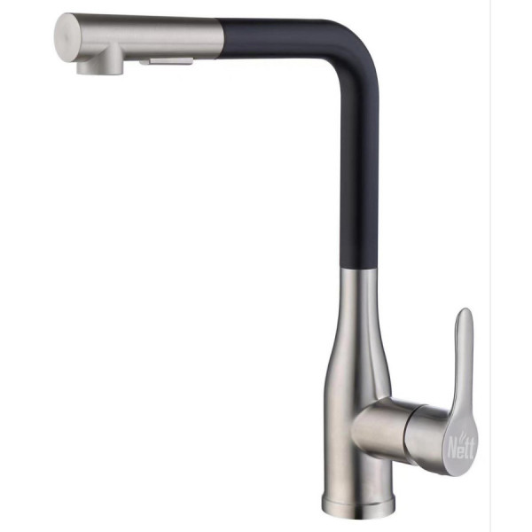 Кран выполнен в черном и нержавеющем цвете,что делает его уникальным с дизайнерской точки зрения.Данную модель смесителя можно комплектовать к любой нержавеющей мойке,в независимости от цвета мойки.