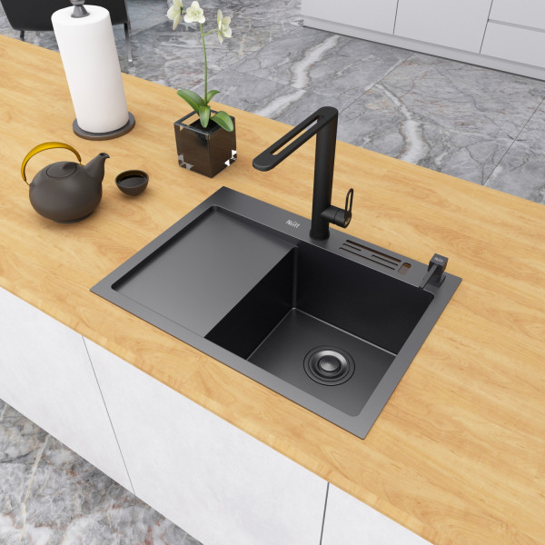 Элегантная черная мойка укомплектована специализированным Nano покрытием, которое повышает ее стойкость к царапинам и другим механическим повреждениям. PVD покрытие также эффективно противостоит коррозии.