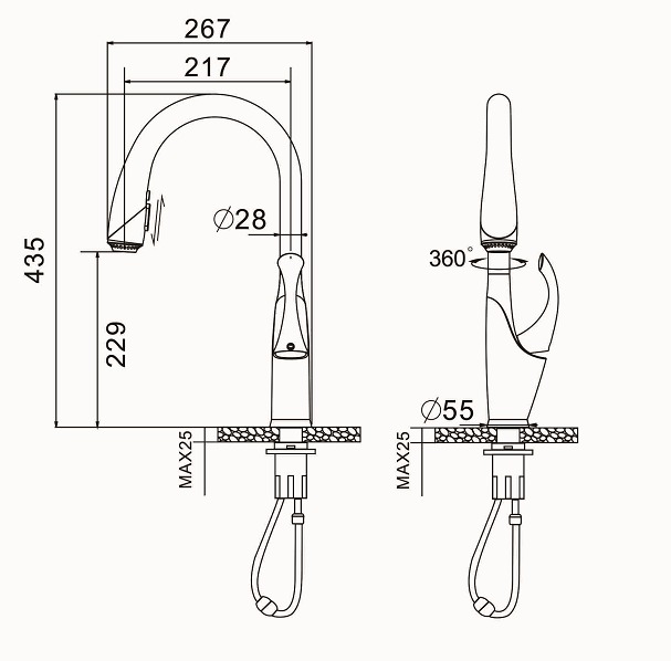 Кран для кухни имеет выдвижной распылитель, который беспрепятственно возвращается в исходное положение, стыкуясь плавно и уверенно. Гравитационная система расположена внутри носика, надёжно фиксирует распылитель на место.