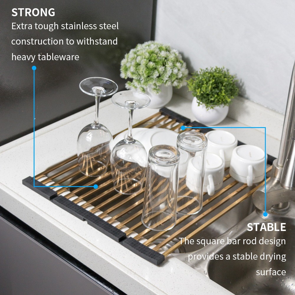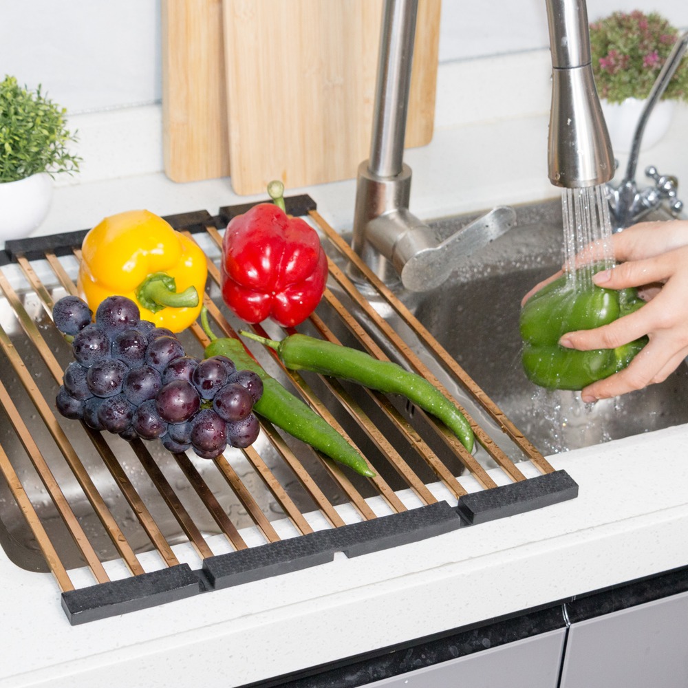 Сушка изготовлена из высококачественной нержавеющей стали с силиконовыми бортиками, которая поможет вам легко и просто сушить  посуду,фрукты, овощи и так же создаст безопасную поверхность для слива после мытья.