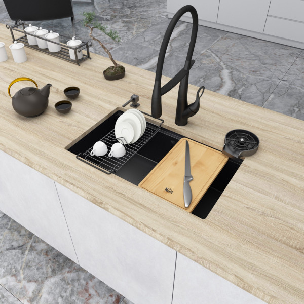 Элегантная черная мойка изготовлена из нержавеющей стали AISI 304 высокого качества, обеспечивающей прочность и долгий срок службы.